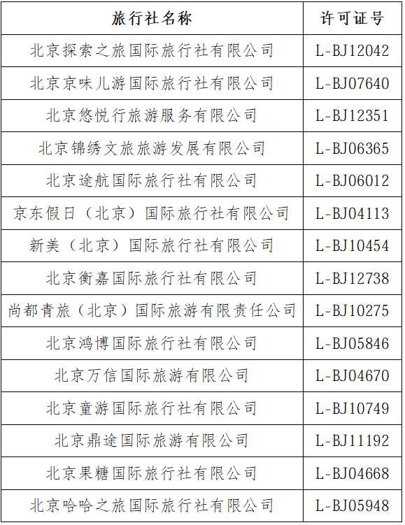 本期上榜旅行社,除尚都青旅(北京)国际旅游有限责任公司,其余14家旅行社前期均因存在违法违规问题或者投诉较多,已经被暂停了北京市旅游团队电子行程单系统备案权限,目前暂不具备组织安排团队游客实际出游的相关条件。