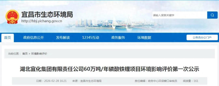 不久前,宜昌市生态环境局发布消息,对湖北宜化集团有限责任公司60万吨/年磷酸铁锂项目环境影响评价进行第一次公示。项目位于湖北省宜昌市姚家港化工园C区,总投资489375万元,以磷酸铁、碳酸锂等为主要原料,建设60万吨/年磷酸铁锂生产装置。